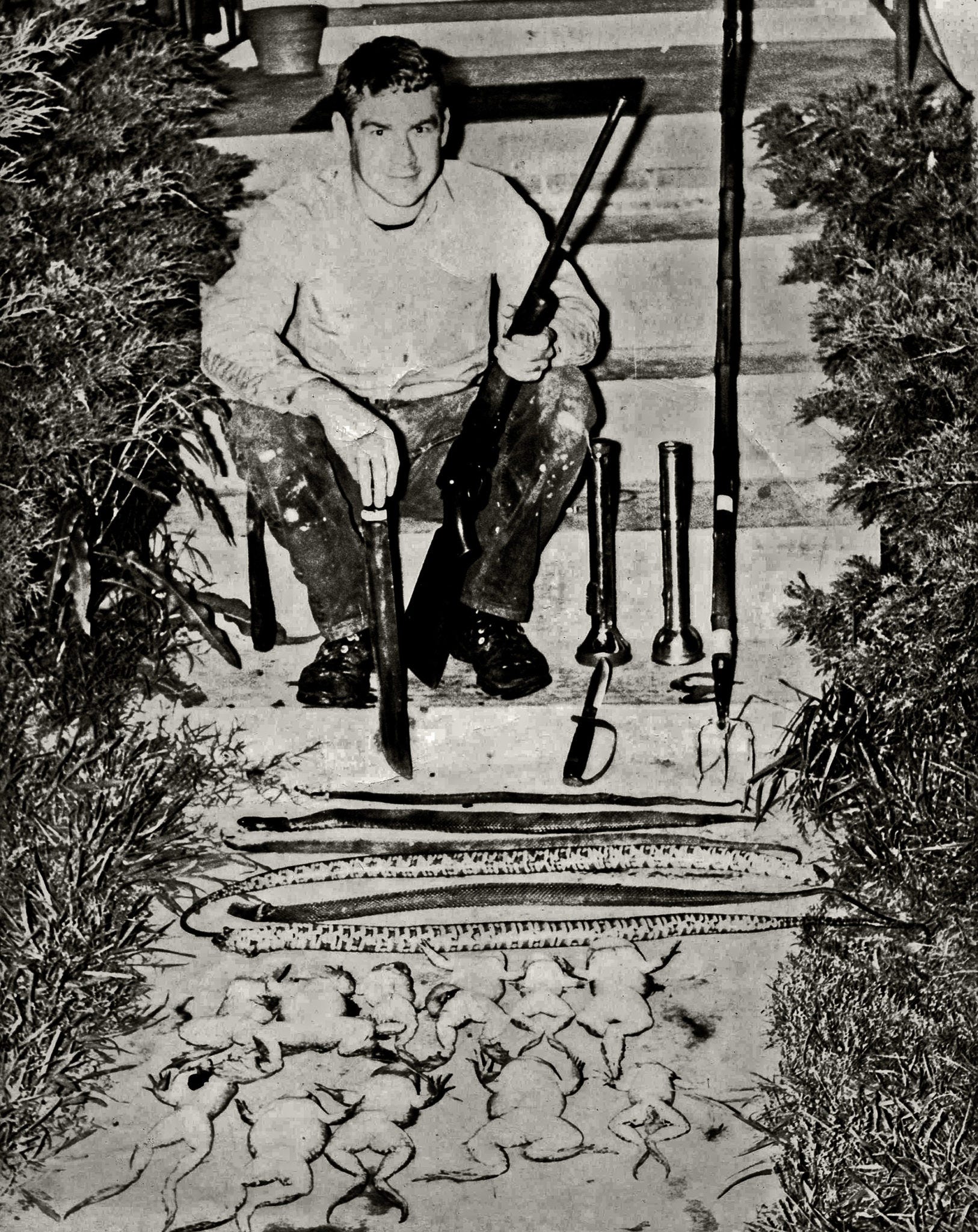 Frogging requires strong illumination. Thus, I carried a powerful, five-cell flashlight with a tight beam. Because houses were nearby, instead of our usual .22 rifle, we had a quieter, far more primitive device — a gig. This is basically a steel fish spear with three or four barbed prongs mounted on a 10-foot bamboo pole. Scottie was the gig bearer; I was the spotter.