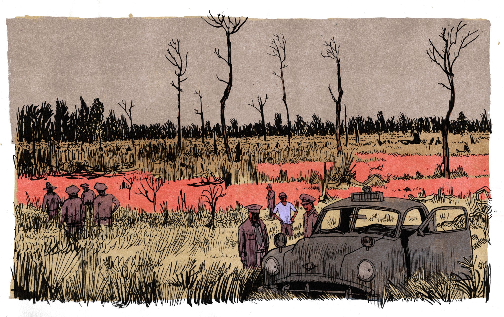 We then drove back to the police station, arriving just before 6 a.m. What happened next was, remarkably, not the work of my imagination. Awaiting was a party of 10 men with pistols, shotguns and high-powered rifles with scopes. On their belts were big, sheathed hunting knives. All had serious, determined faces. In the back of a nearby pickup truck, we could hear the tracking dogs — beagles and bloodhounds, barking in anticipation inside their cages.